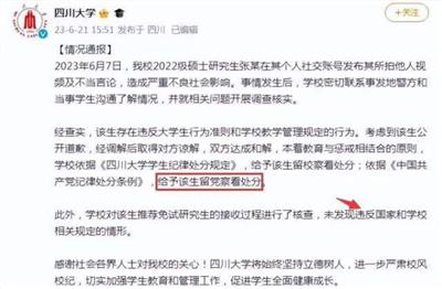 此事件特别是张薇发表对农民工的“侵权”的言论之后,引起了全国网友的极大愤慨,纷纷要求四川大学开除张薇的学籍。固然对一个犯错误的学生组织处理确实需要慎重。四川大学没有急于组织处理,笔者认为是正确的。但不急于组织处理不等于不对其错误进行严厉的批评教育,帮助本人认识错误的实质。但据笔者了解,四川大学也表态与警方联系,并联系本人要求向农民工道歉,并告知有开除学籍的可能。这种做法是正确的。但笔者认为,校方并没有帮助张薇真正认识自己的错误实质究竟在什么地方?为什么会犯这样的错误?所以才导致张薇的纸面上的非常没有水平的“道歉”声明,导致事件的继续扩大。从这个意义上说,四川大学对这一事件也有不可推卸的责任。6月21日四川大学做出留校察看和留党察看的处分。在这个“情况通报”中,仅仅指出张薇同学“在其个人社交账号发布其所拍他人视频及不当言论,造成严重不良社会影响。”“经考察,该生存在违反大学生行为准则和学校教学管理规定的行为,考虑到该生公开道歉,经调解后取得对方谅解,双方达成和解,本着教育与惩戒相结合的原则”,学校给于该生留校察看和留党察看处分。问题在于这个“通报”没有具体指出张薇的“不当言论”究竟是什么?错误实质究竟是什么?“严重不良社会影响”究竟是什么?形成这种错误的思想根源是什么?这样的“通报“能够起到对“张薇”的教育作用吗?能够起到对其他学生的引以为戒的教育作用吗?联想到2021年的对天津一中学教师和今年对安徽师范学院陈宏友错误的组织处理决定不也是只注重组织处理而不注重思想批判和思想教育吗?