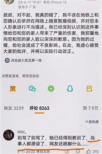 第四,虚假的道歉行为。农民工的儿子发现张薇网络上继续攻击其父之后,告到广州某派出所。派出所传唤张薇,张薇在网络上发表了一篇道歉声明。网友评论说,这不是发自内心的真诚的道歉,而是迫于压力的被迫的道歉,是因为她得到消息,四川大学可能要开除他。而且这篇声明说自己“错了”,“不该随意在散布视频”,不该对农民工“进行不当描述”,向农民工及家人致以深深的歉意。明眼人一看,就不是真诚道歉。为什么道歉声明中丝毫没有涉及自己内心为什么要诬陷污蔑他人偷拍自己?为什么在地铁上澄清事实之后,还要把农民工的视频发到网上,还造出如此之多的污蔑词汇?其“不该”、“不当”的内在的原因究竟是什么?一方面大声指责别人侵权,另一方面自己却用实际行动对农民工进行违法“侵权”。这是一个正常人的所作所为吗?其目的究竟是什么?如此操作,正说明张薇的人品、道德卑鄙无耻。且网友也用大量事实揭露张薇丝毫没有认识自己的错误。且还在叫嚣自己是一名研究生,怎能向一名低贱的农民工道歉?
