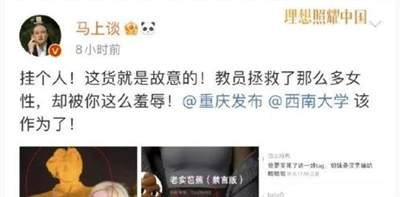 “马上谈”指它就是故意的,还不平的说“教员拯救了那么多女性,却被这么羞辱!”
