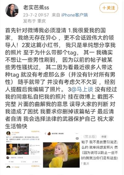 对于它被“马上谈”挂了,XXN还专门在微博上发帖予以否认,然后以“马上谈”没经她同意把它的照片挂在微博上为由,威胁要选择法律武器保护自己。