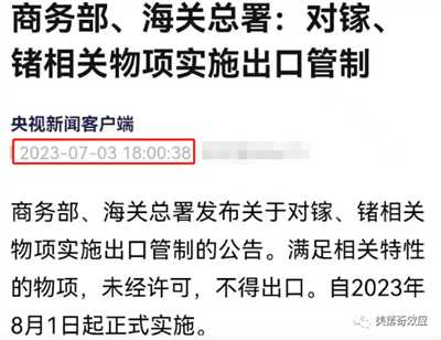 7月3日傍晚,中国突然发布《关干对镓、锗相关物项实施出口管制的公告》,根据相关法律,为维护国家安全和利益,自2023年8月1日起,对镓相关物项包含氮化镓、砷化镓、铟镓砷等;锗相关物项包含磷锗锌、锗外延生长衬底、二氧化锗等,进行出口管制。满足相关特性的物项,未经许可,不得出口。
