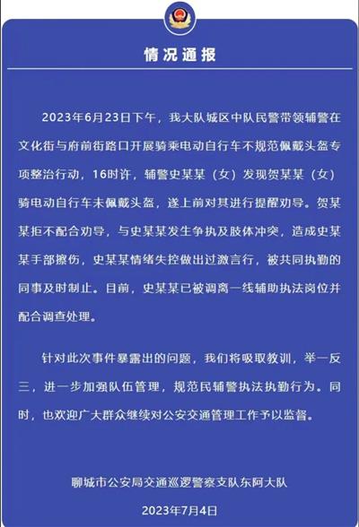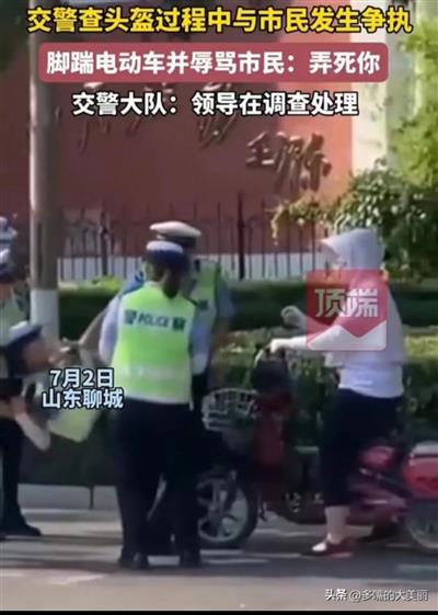 6月23日,山东聊城东阿县一名女交警在执勤过程中,发现一名女子骑电动自行车没有佩戴头盔,遂将其拦下,并对其进行提醒劝导。该女子不配合劝导,便与女交警发生言语肢体冲突,造成女交警手部擦伤,女交警情绪失控做出过激言行,被共同执勤的同事及时制止。