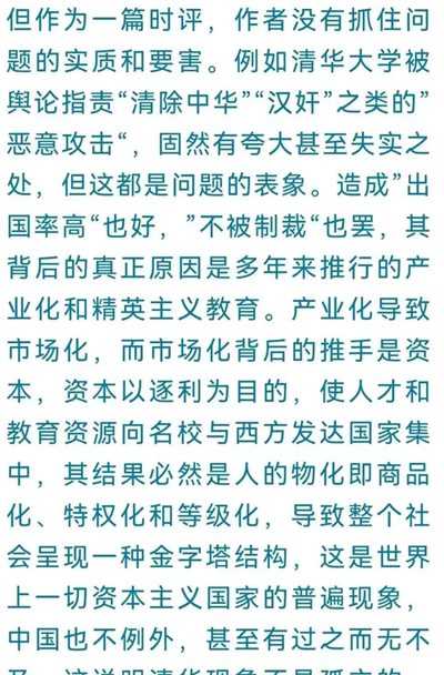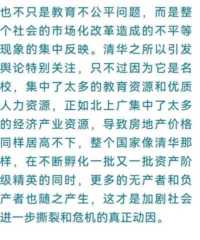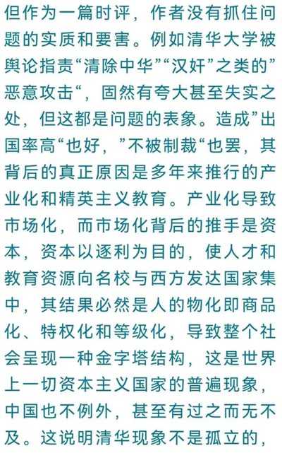 清华发声是让人喜闻乐见的,这至少表明这所国内顶尖、世界一流的大学对来自底层大众批评的声音没有缺乏反应,而是开始认真对待。虽然这些来自底层的声音不乏博取流量之嫌,听起来似乎也不甚高明,谣言与真相齐飞,偏激与深刻夹杂,但能在底层大众中获得很高的传播量,并激起一定程度的共鸣感,说明确实迎合了大众对清华的一些感性印象,客观上对很多人的意识和潜意识造成较大的影响力。从讲求实际的角度,此时正值高考后报志愿,谣言虽终归是谣言,但“三人成虎”,若任这些泛滥,必定会对自身形象造成伤害,也会影响高分考生的选择,便宜了隔壁的北大。借这几篇反驳的文章,也是一种形象公关和招生宣传。