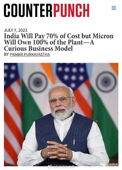 印度上周向美国美光公司郑重承诺:印度政府将提供50%补贴,古吉拉特邦政府再提供20%补贴。美光只需要投资总资本的30%即8.25亿美元,就持有芯片工厂100%的所有权。