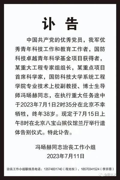 7月1日,我国著名指挥控制和人工智能领域专家、国防科技大学系统工程学院副教授博士生导师冯旸赫同志,在北京因车祸不幸逝世,英年38岁。