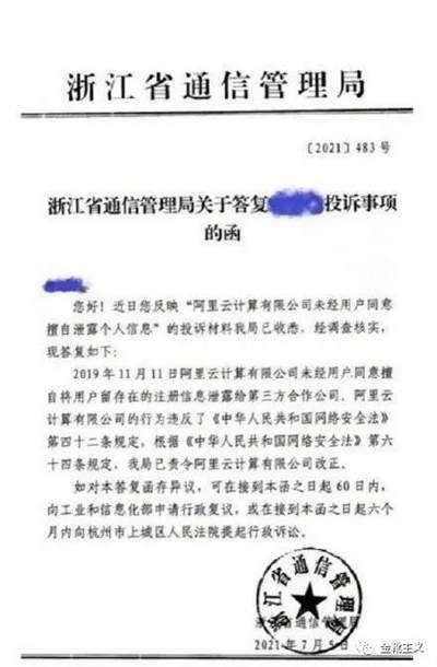 去年8月,一份浙江省通信管理局对投诉人的答复函自网络流出,显示在2019年双11期间,阿里云计算有限公司未经用户同意,擅自将用户留存的注册信息泄露给第三方合作公司;