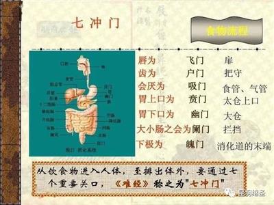 其实,“七冲”是中医术语,即《难经》中的“七冲门”,指的是人体消化系统从上到下的七道关门,依次是: