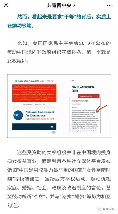 然而,正如团团所言,这些看起来要求平等的背后,实质上是在煽动极端。而美国国家民主基金会于2019年公布的资助中国境内非政府组织花费排名,名列第一的就是“女拳师”组织。