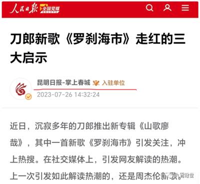 在刀郎此曲出现的前半个月,网络上几乎没有反对者,是一边倒的赞扬,这种热度至今也没有退去。现在,反对声已经出现,有的说刀郎的新曲“低俗”,有的说那谁要给刀郎发律师函、刀郎可能要坐牢,有的说刀郎新曲涉嫌抄袭某某某,有的说刀郎的歌曲可能要下架,有的说人民日报和央视根本没有肯定刀郎的新曲(这个可能是真的,因为我没有查到人民日报和央视肯定刀郎新曲的直接信息。不过,人民日报 转发了《昆明日报》的一则消息,显然是表示了对刀郎的支持。见下图),还有人提出要“严查无良平台和自媒体营销号连续十多天借刀郎新歌《罗刹海市》拉踩引战带节奏,煽动阶层对立,制造网络暴力,引发舆情,把网络环境搞得乌烟瘴气。”有的说:警惕《罗刹海市》回响中的怨气和戾气;又有人说,刀郎新曲的点击并没有那么多,是有人造谣⋯⋯总之,就是表达对刀郎新歌的诅咒、厌恶、反感、贬低、痛恨。