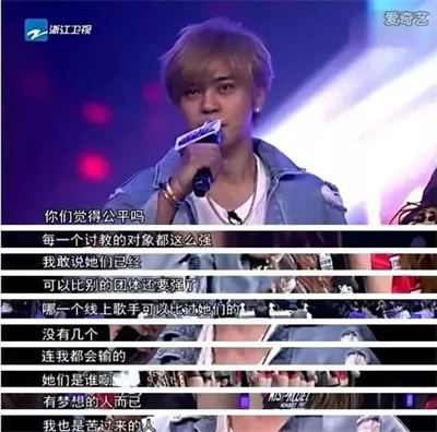 “你们觉得公平么?每一个挑战的对象都这么强,哪个线上歌手可以比过她们,没有几个!连我都会输的!她们是谁啊?她们只是素人而已!有梦想的人而已!但今天梦想碎了,什么都没了!我也是苦过来的人,我懂她们的心情,她们要舞台,现在没有舞台了!”