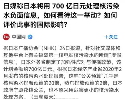 与排放核污染水同步的,是日本政府组织开始了大型的舆论战,还拨出专款高达700亿日元,声称日本外务省计划加强对策和“战略性外宣”,针对核污染水的所谓“虚假信息”。