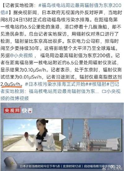 就在8月24日的排污现场,有人用仪器测量,排放前该区域的瞬时核辐射测量值从0慢慢变为0.3μsv,在排放时瞬时辐射值增至0.7μsv......处于东京时,辐射仪测试结果为0.01μSv/h,而福岛沿途测试,辐射仪最高指数达到2.0μSv/h。表明福岛周边最高辐射值为东京200倍。证明日本所谓的“高科技净化稀释”完全是撒谎。