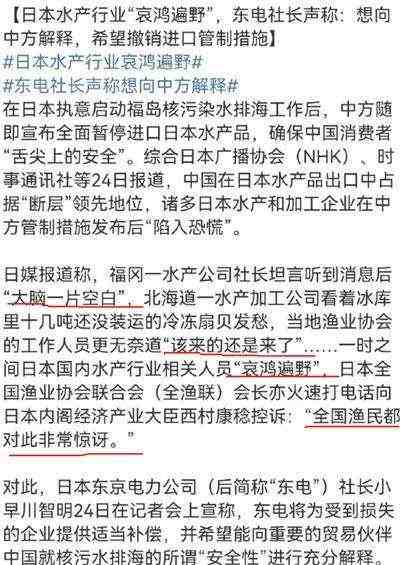 在日本执意启动福岛核污染水排海工作后,中方随即宣布全面暂停进口日本水产品,然后日本水产业就开始“哀鸿遍野”,日本全国渔业协会联合会(全渔联)会长亦火速打电话向日本内阁经济产业大臣西村康稔控诉:“全国渔民都对此非常惊讶。”