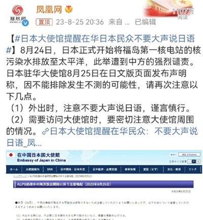 昨天,日本驻华大使馆在日文版页面给所谓的在华日本人发布“预警”,因不能排除发生不测的可能性,请再次注意以下几点:(1)外出时,注意不要大声说日语,谨言慎行。(2)需要访问大使馆时,要密切注意大使馆周围的情况。