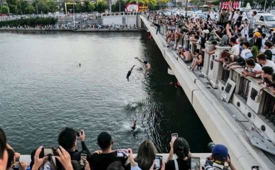 近日,天津的跳水大爷们突然引发大量关注。在社交媒体上,多段天津大爷大妈在海河跳水的视频广为流传,并使得海河上的狮子林桥、北安桥等地成为网红打卡“景点”。现在的天津狮子林桥,从早到晚都聚满来看“天津跳水大爷”的人,还有人现场开起直播带货(来源: 2023-09-04央广网)。