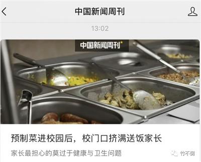 今天下午中国新闻周刊采访刊发了一篇文章,“预制菜进校园后,校门口挤满送饭家长”,他们写道,“xx中学多名家长发布视频,抱怨配送的午餐速度慢、质量差、口感不佳。其中一名家长晒出午餐,肉很咸,菜叶发黄,腐竹酸的,孩子根本吃不下……”