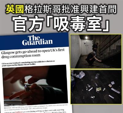 英国以美国为榜样,近日在位于格拉斯哥东区投资了230万英镑,建设了英国首个吸毒中心。英国政府宣称官办的吸毒、注射毒品室能减少在公共场所注射毒品的行为并减少死亡。