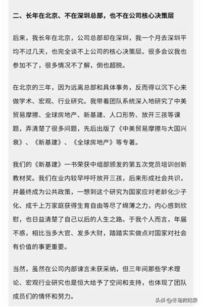 “后来,我长年在北京,公司总部在深圳,我一个月去深圳平均不过几天,也完全谈不上公司的核心决策层。很多会议我也参加不了,很多情况不了解,倒也超脱。”“在北京的三年,因为远离总部和具体事务,反而得以沉下心来做学术、宏观、行业研究。”