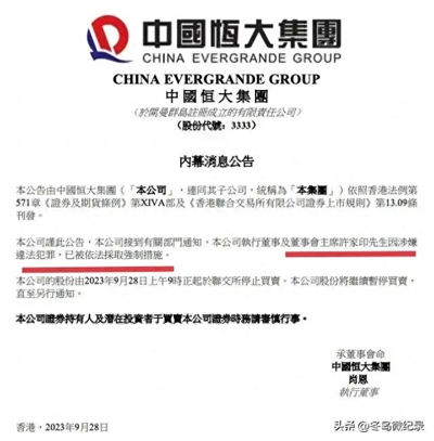 9月28日晚,中国恒大在港交所公告称,公司执行董事及董事会主席许家印因涉嫌违法犯罪,已被依法采取强制措施。