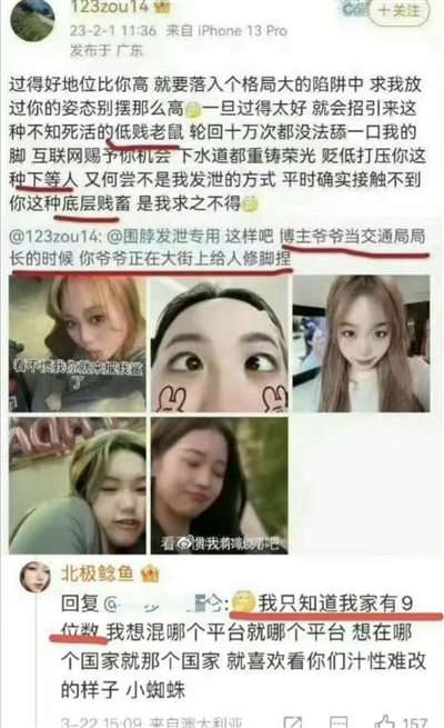 “北极鲶鱼”几个月前在微博炫耀“我只知道我家里有9位数,我想混哪个平台就混哪个平台,想在哪个国家就在哪个国家。”“(爷爷)脸上写了四个大字‘感觉贪了’,骂网友是“低贱老鼠”“下等人”“底层溅畜”。她的微博言论里,时刻充满高傲自大,对底层老百姓强烈地鄙视和侮辱,对中国的不屑!