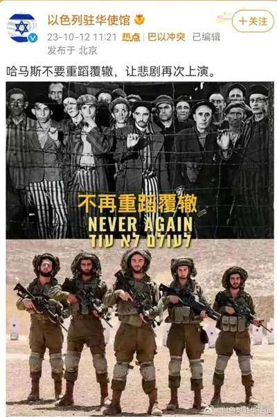 今天,以色列大使馆甚至还用奥斯维辛的照片威胁哈马斯——“不要重蹈覆辙,让悲剧再次上演”。你看看,他们已经把自己代入到纳粹的角色中了。