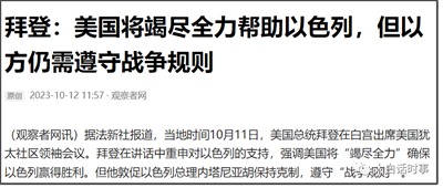 拜登在10月11日讲话中强调美国将“竭尽全力”确保以色列赢得胜利。但他敦促以色列总理内塔尼亚胡保持克制,遵守“战争规则”。