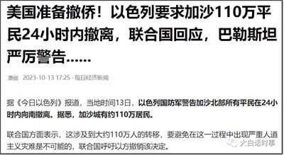 在以色列战争内阁组建完之后没多久,以色列军方在10月12日晚通知联合国,加沙地带的110万巴勒斯坦人应在24小时内迁移到加沙地带南部。