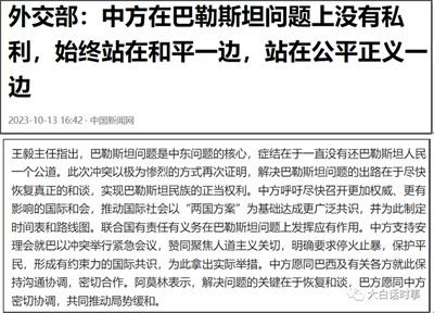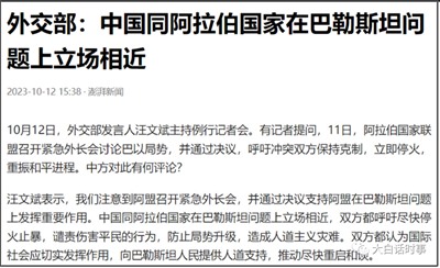10月12日,我们外交部发言人表示,“中国同阿拉伯国家在巴勒斯坦问题上立场相近,双方都呼吁尽快停火止暴,谴责伤害平民的行为,防止局势升级,造成人道主义灾难。”