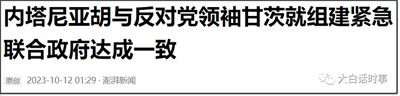10月12日,内塔尼亚胡同意与反对派组建联合政府指挥作战。