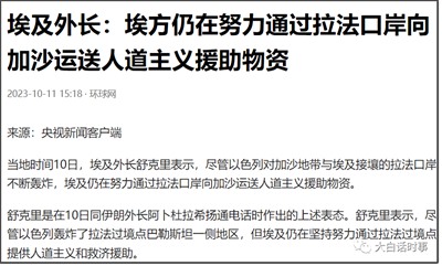 10日,埃及外长表示,尽管以色列对加沙地带与埃及接壤的拉法口岸不断轰炸,埃及仍在努力通过拉法口岸向加沙运送人道主义援助物资。