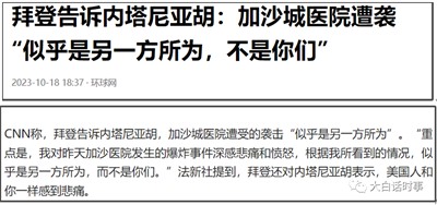 拜登今天访问以色列的时候,跟内塔尼亚胡说,“我对昨天加沙医院发生的爆炸事件深感悲痛和愤怒,根据我所看到的情况,似乎是另一方所为,而不是你们。”