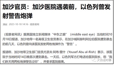 加沙地带一名高级卫生官员表示,在加沙城阿赫利阿拉伯医院遭到袭击的前几天,以色列曾向该医院发射两枚炮弹作为“警告”。