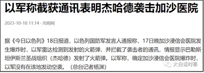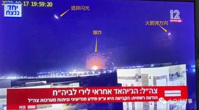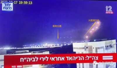 以色列国防军发言人声称,17日晚加沙浸信会医院发生爆炸时,以军雷达检测到发射的火箭弹,并拦截了袭击者的通讯,情报显示巴勒斯坦伊斯兰圣战组织(杰哈德)发射了火箭弹。