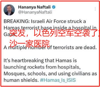 惨案发生后,以色列军方宣传人员哈纳尼亚·纳夫塔利第一时间发文庆贺,把轰炸医院事件当成了以色列空军的战果进行大肆宣传。