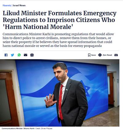 而以色列通讯部长卡希宣布自己正在制定紧急条例,如果政府认为以色列平民传播了可能损害国家士气或成为敌人宣传基础的信息,那警察可以将其逮捕并没收财产。