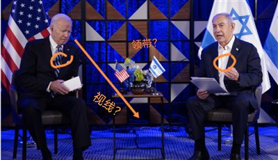 不说近期布林肯被内塔尼亚胡多次打脸的事,上图是网上流传出10月18日美国总统访问以色列,与内塔尼亚胡会谈的场景。注意笔者标绘的情况:拜登的视线、拜登与内塔尼亚胡的着装。