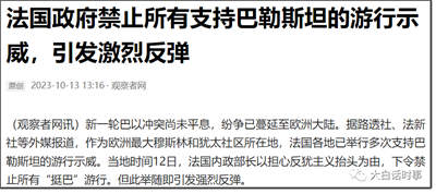 比方说,在10月12日,法国内政部长以担心反犹主义抬头为由,下令禁止所有“挺巴”游行。