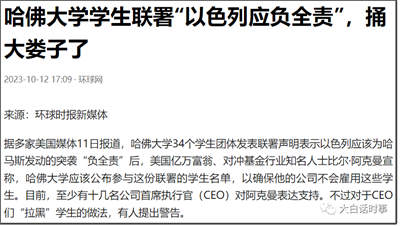 最早,在10月11日,哈佛大学34个学生团体发表联署声明,表示以色列应该为哈马斯发动的突袭“负全责”。