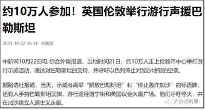 10月21日,英国伦敦有10万人参与游行,表达对巴勒斯坦的支持,呼吁以色列停止对加沙地带的空袭。