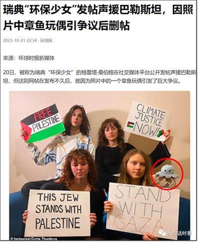 10月20日,桑伯格在社交平台发了个照片,声援巴勒斯坦,结果因为她在照片里出现了一个章鱼玩偶,就被一些人说是“反犹太人”的种族主义立场。