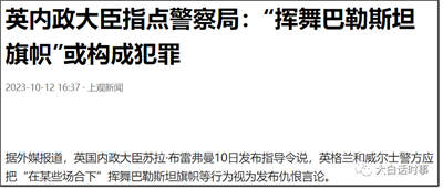 比如,英国内政大臣在10月12日发布指导令时说,英格兰和威尔士警方应把“在某些场合下”挥舞巴勒斯坦旗帜等行为视为发布仇恨言论。