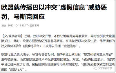 然后,10月11日,欧盟就对马斯克严厉警告称,在此轮巴以冲突发生后,他所拥有的社交媒体X平台正被用以传播“虚假信息”