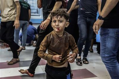 ▲ 2023年10月,加沙一家医院里,一名受伤的巴勒斯坦儿童正在等待接受治疗。