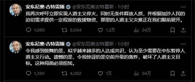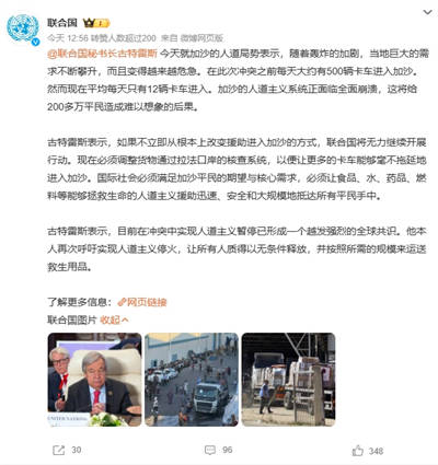 联合国在震惊之余,却也只能在社交媒体上发贴,说古特雷斯要求以色列同意更多的人道主义救援物资进入加沙。