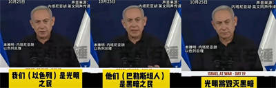 内塔尼亚胡甚至于连如以色列是光明之民、巴勒斯坦人是黑暗之民,光明毁灭黑暗这种充满了纳粹内涵的话,都说了出来。