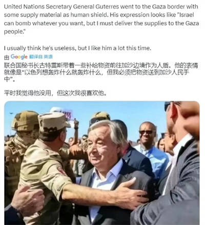 昨天,网上流传一条消息,说是古特雷斯为了能让人道主义救援物资进入加沙,他第二次去了埃及与加沙边境口岸,亲自当起了肉盾。