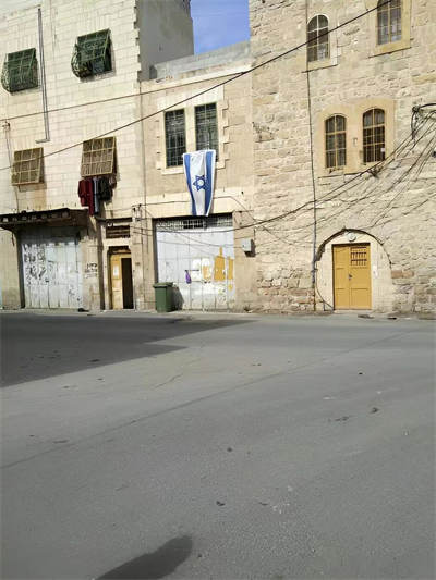被强制关闭的临街店铺以及定居者悬挂的以色列国旗