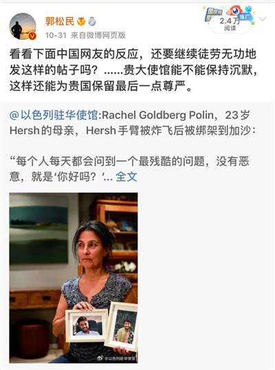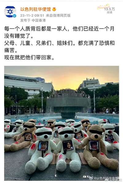 这是以色列驻中国大使馆的官微今天发布的,意图非常明显,就是要赢得中国网友的支持。