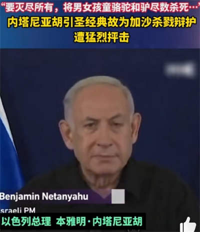 最近,以色列总理内塔尼亚胡又发表暴论,他用犹太圣经中的文字为在加沙的杀戮而辩护——“要灭尽所有,将男女孩童骆驼和驴尽数杀死”。