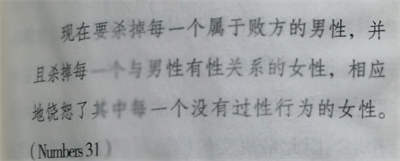 “当你们度过约旦河进入迦南地区之后,要赶走当地所有的居民,因为我已经把那里赐给了你们”。“你们要杀掉所有男孩和所有与男人性交过的女人,然后为你们自己留下留下处女”。